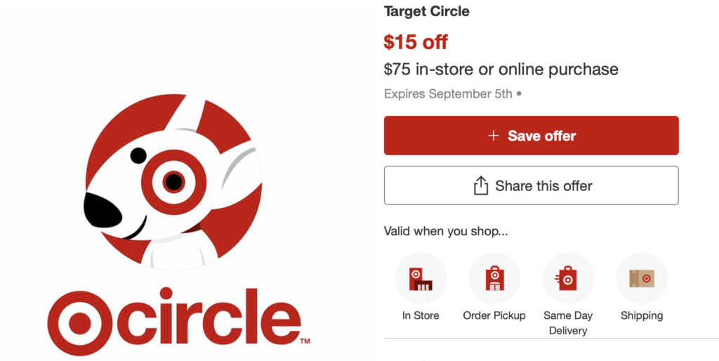 Check your Target Circle account for this recently added Offer that’ll save you $15 when you spend $75 or more in one purchase.