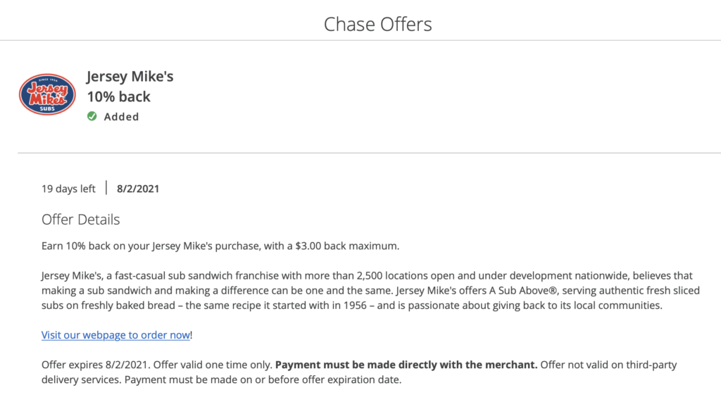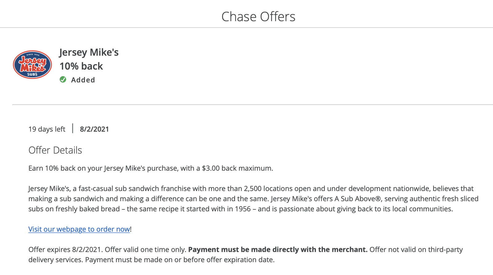 If you have it available, you’ll earn 10% back on your Jersey Mike’s purchase when you pay with the Chase card on which you’ve added the Offer.
