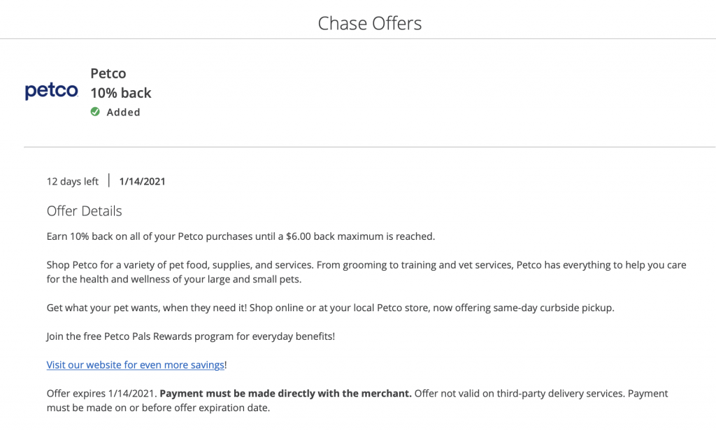 If you have pets to buy for and Petco is your preferred store – or you’re up for giving them a try – you can save 10% on your next Petco purchase up to a $6 maximum with this Chase Offer.