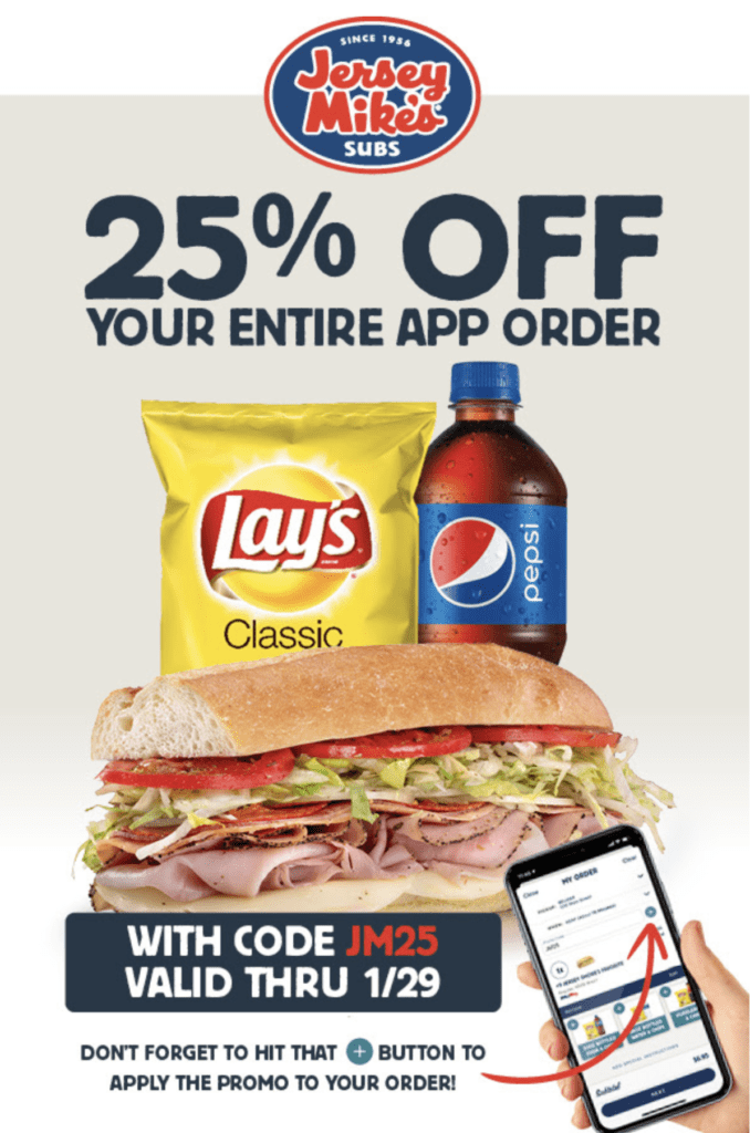 Jersey Mike’s is offering 25% off your entire app order beginning Tuesday, January 26 and running through Friday, January 29, 2021.