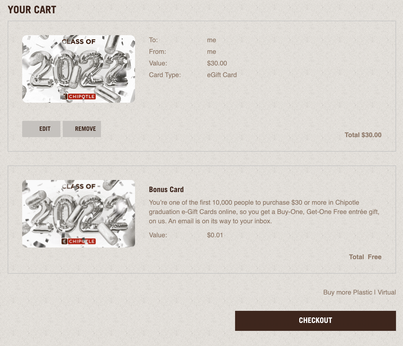 Follow these steps and on the checkout page, you'll see a Bonus Card added to your order (see image) with the language, "You’re one of the first 10,000 people to purchase $30 or more in Chipotle graduation e-Gift Cards online, so you get a Buy-One, Get-One Free entrée gift, on us. An email is on its way to your inbox."