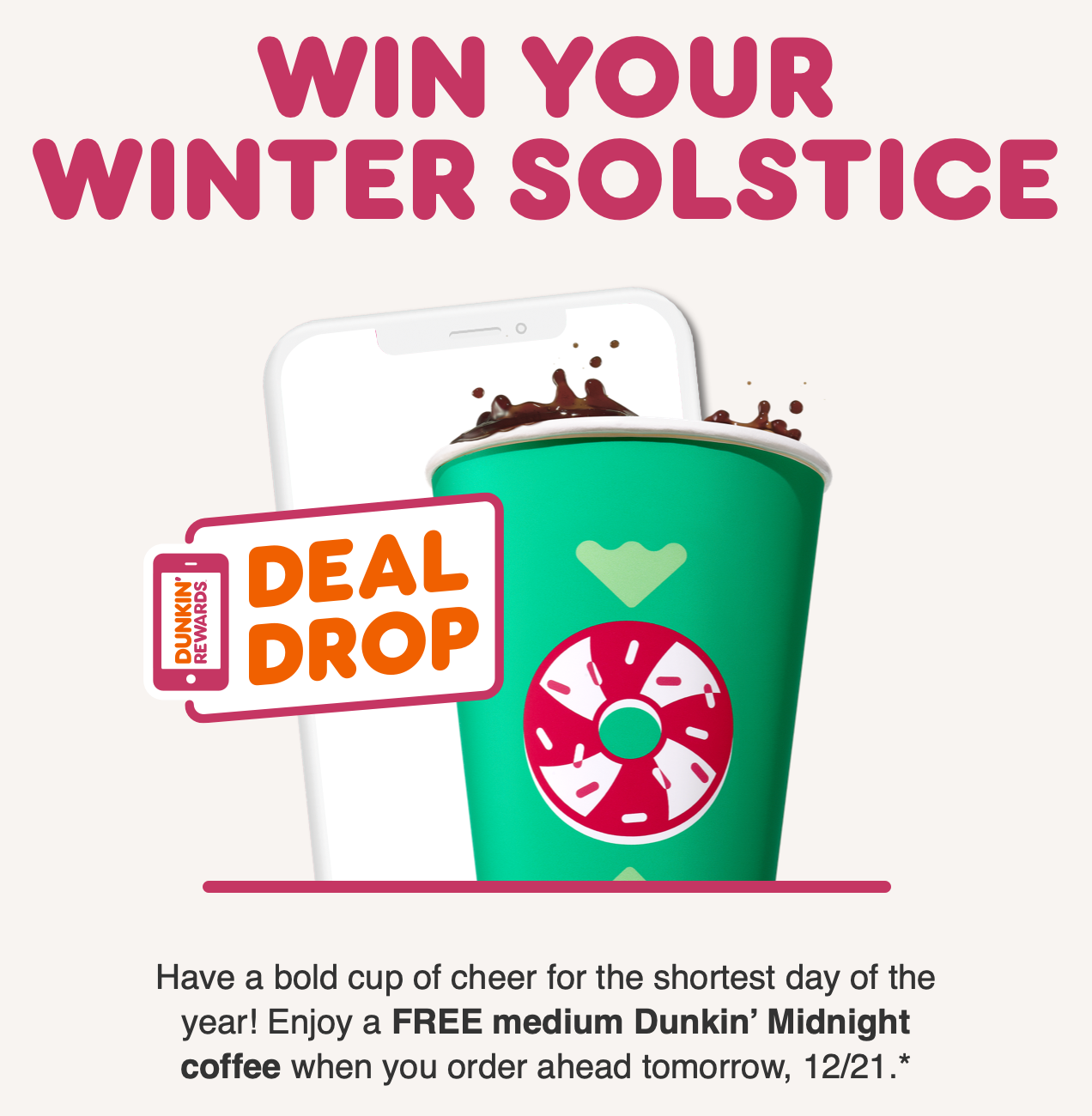 Dunkin' is offering Rewards members a free medium Dunkin' Midnight coffee Wednesday, December 21st, when it's ordered via the Order Ahead option on the Dunkin' app.