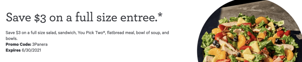Panera is offering $3 off any full size entree – sandwiches, salads, flatbreads, bowls and more – now through June 30, 2021.