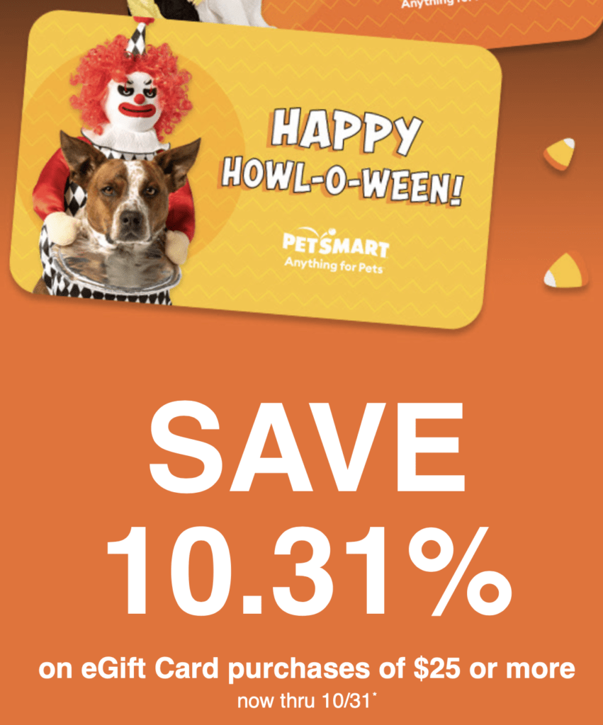 PetSmart is offering a 10.31% savings on eGift Cards now through October 31, 2021.