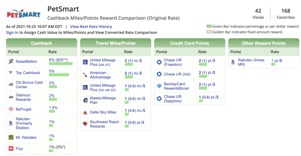 The image above shows what’s currently being offered at the various shopping portals. Cash back and points rates can, and do, change regularly, so be sure to check the Cashback Monitor PetSmart page for the latest numbers.
