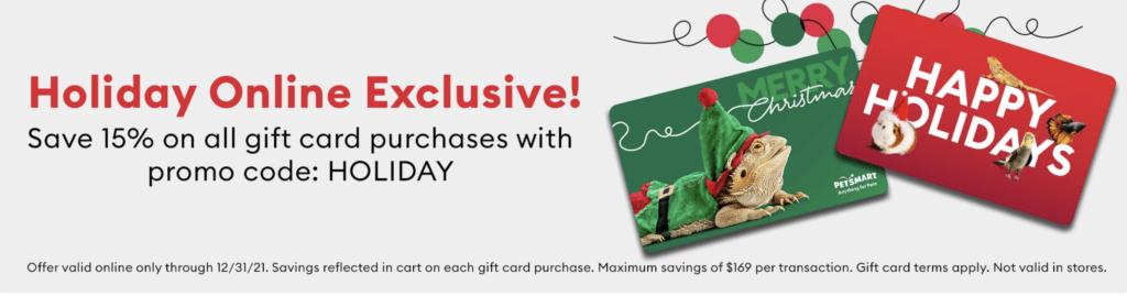 PetSmart is offering a 15% savings on its gift cards – both digital and physical cards – now through December 31, 2021 when the Promo Code: HOLIDAY is used at checkout.