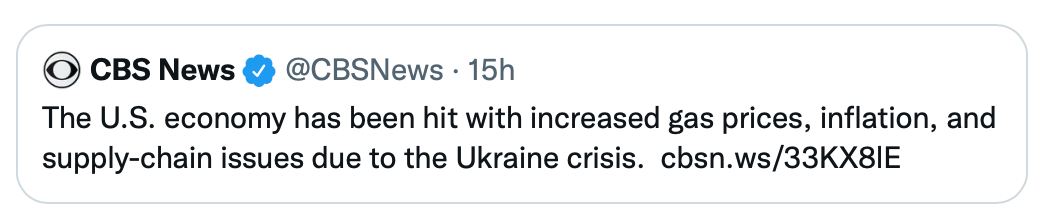 On February 22, 2022, CBS News tweeted a headline that stated, "The U.S. economy has been hit with increased gas prices, inflation, and supply-chain issues due to the Ukraine crisis."