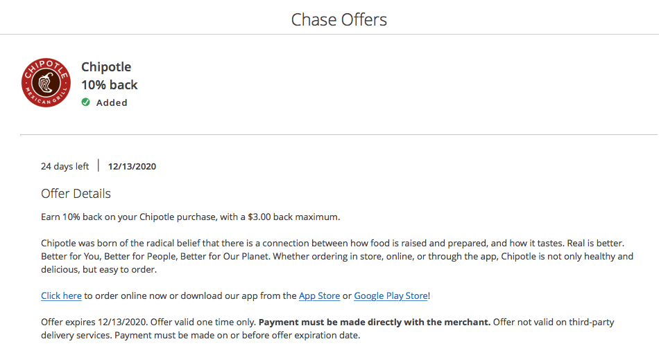 Check your Chase Offers for this 10% back Offer on your Chipotle purchase.