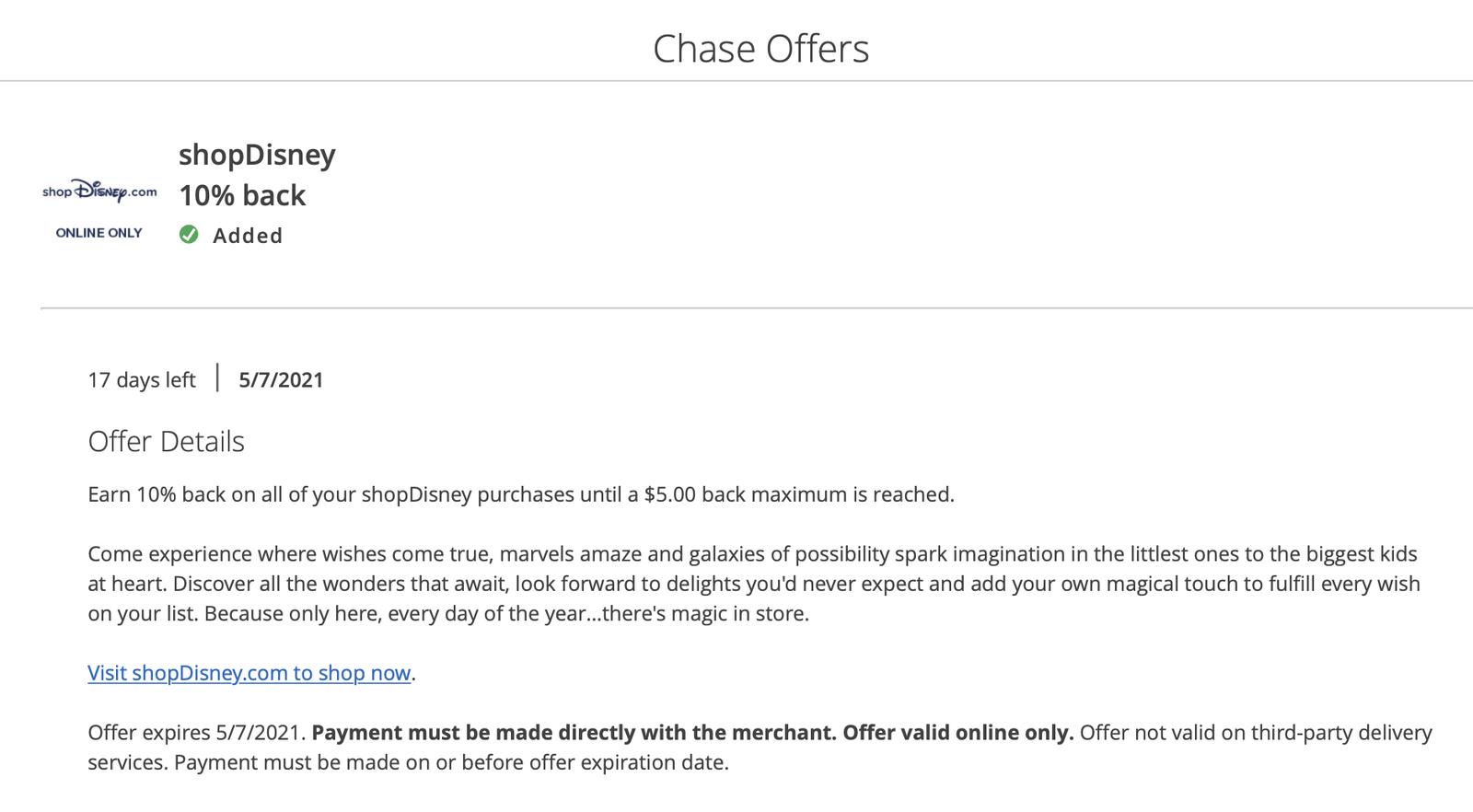 Once the Offer is added to your Chase credit card, and that card is used to make a purchase at shopDisney, you’ll earn 10% back up to a $5 maximum as a statement credit.
