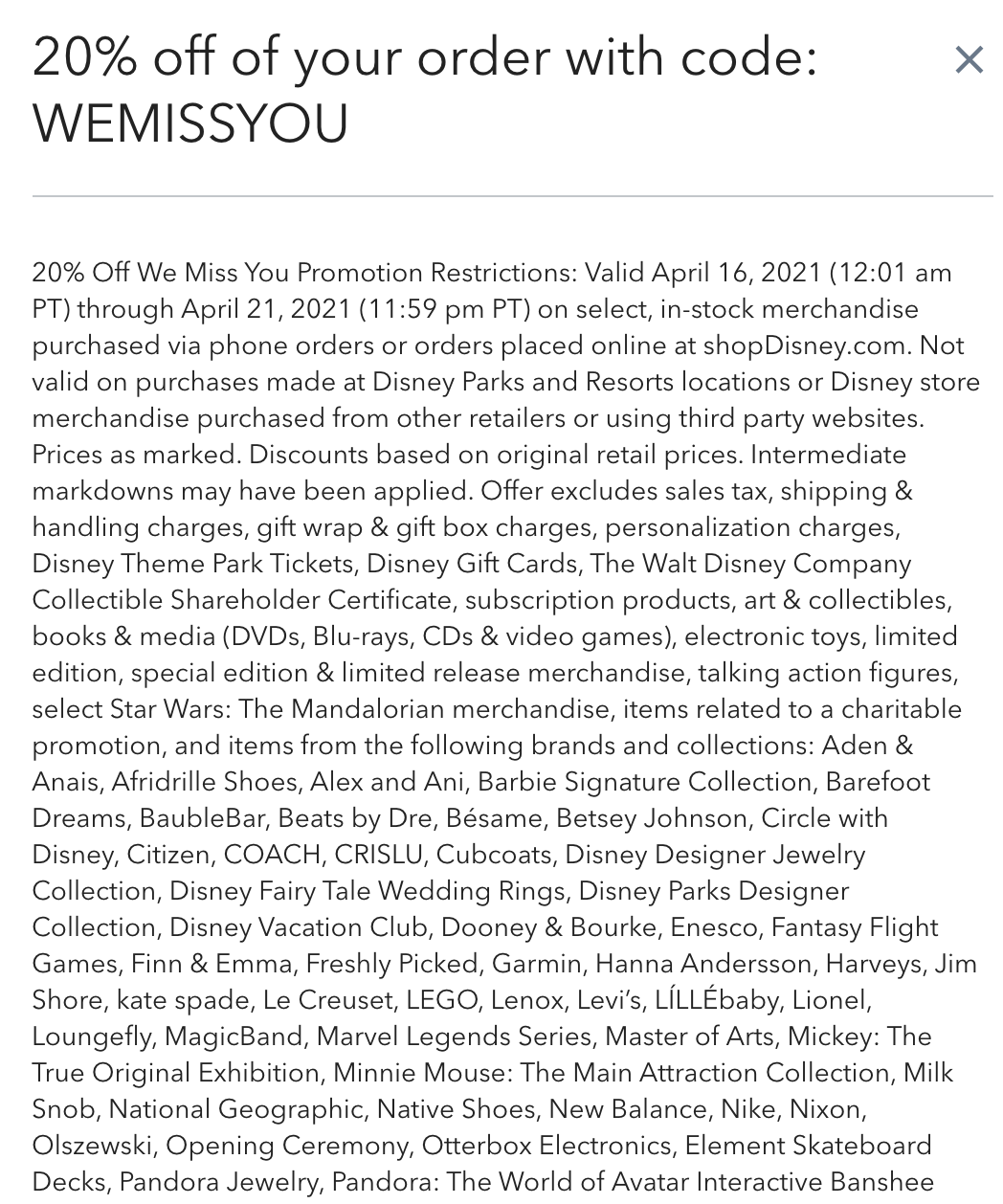 Of course, there are a number of items that are excluded from the 20% off deal. You can add items to your shopDisney cart and try the WEMISSYOU code to see if the item(s) you’ve selected are excluded, or scan the list associated with the promo code’s “details” link when entered on the checkout page…some of the exclusions can be seen in the image below.